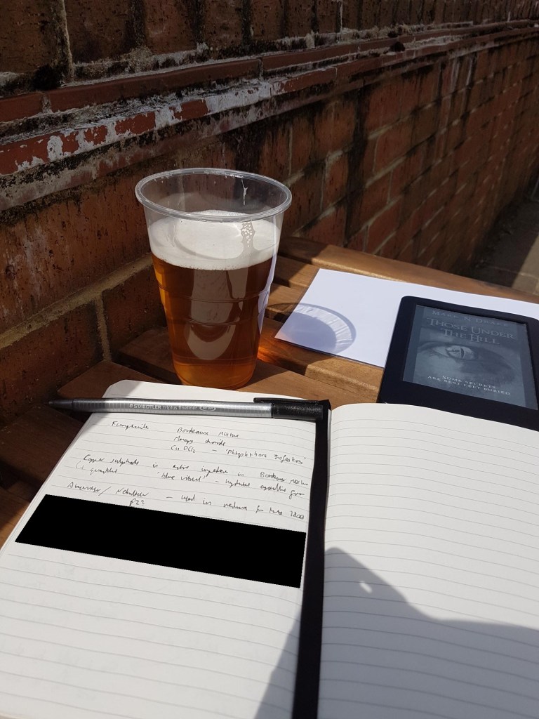 So where did I get to in the space of a sunny afternoon (and five pints)? Well, some thoughts on another part of Darkisle to explore. A rationale for some interesting developments within the Church of the Celestial Shadow. One idea for Something Horrific. And some interesting uses for copper sulphate…. The picture above summarises the progress during the second pint (with the pen hiding a plot idea, and the redacted area hiding the Horrific Something).