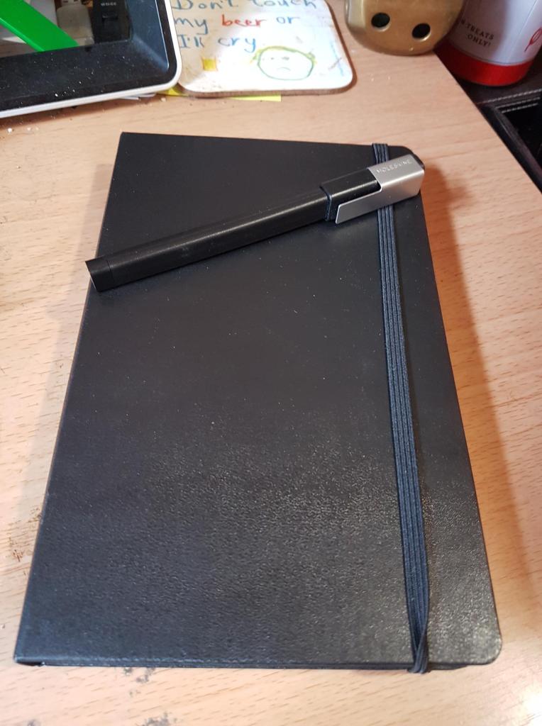 So, finally I am getting down to Book 3. Here’s the Moleskin notebook that I got for Christmas and have been saving for this moment! It even came with a branded pen (which I’m less keen on; the clip makes it heavy and doesn’t actually clip on anything very well, so I can see it getting lost pretty quickly!).