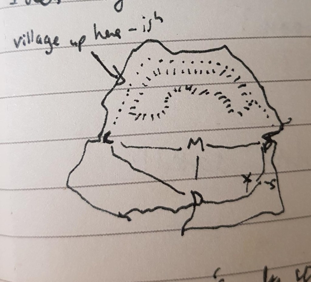 I still have some editing to do, but otherwise that itch is scratched, now, and I can settle down to Book 3 with renewed energy! And it’s not as if I’ve been doing nothing – background research and refinement of ideas continue. So does the sketching of little maps, as evidenced below. Nothing quite says laser-focussed planning in detail like “Village up here-ish.”
